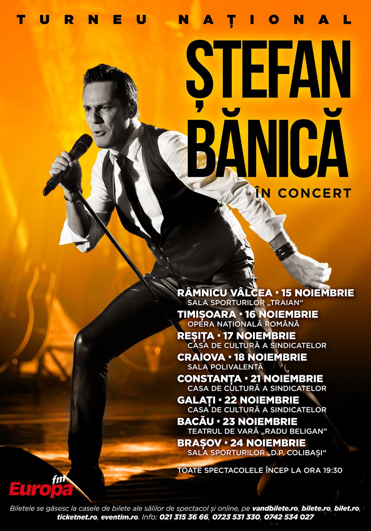 Ștefan Bănică susÈ›ine în luna noiembrie un turneu naÈ›ional în 8 oraÈ™e din È›ară. Un concert incendiar cu Stefan Banica si invitaÈ›ii sai! Vino împreună cu cei dragi sa petreci o super-seara pe ritmuri de rock'n'roll, alături de unul dintre cei mai iubiÈ›i artisti romani. Veti descoperi atmosfera unică a unui show inconfundabil, marca Ștefan Bănică. Multa emoÈ›ie, energie si bucurie! Vor putea fi ascultate live hiturile artistului, asteptate de public de fiecare data, dar È™i noile sale cântece, lansate recent, cum ar fi "Când nu vezi”, “Gură, taci!” sau cea mai noua colaborare a lui Ștefan Bănică alaturi de Cabron, hitul "La masa mea" – https://youtu.be/IirJSBWqwN0