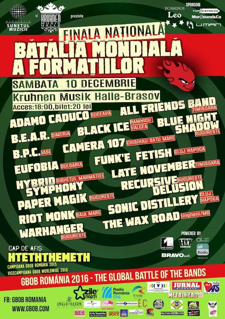 Finala (inter)naÈ›ională GBOB România este o comunitate artistică, muzicală, care va aduna 17 formaÈ›ii din toate regiunile țării (dar È™i din Republica Moldova È™i Bulgaria) precum È™i oameni activi din industria muzicală pe plan naÈ›ional, sâmbătă 10 decembrie - la BraÈ™ov, pentru un spectacol-festival de club.