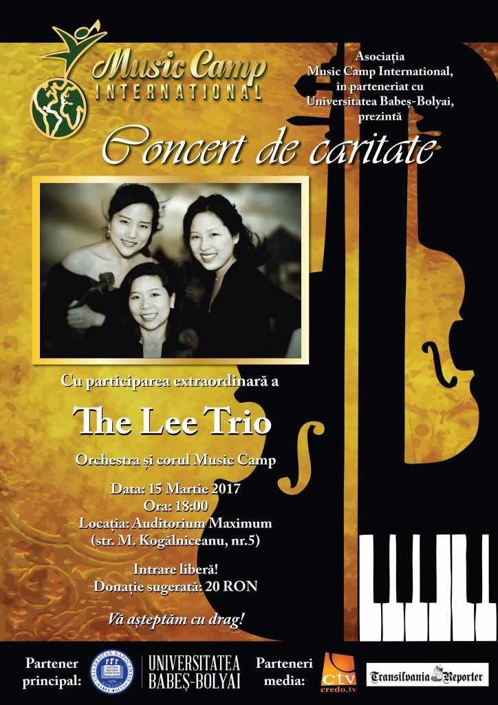 AsociaÈ›ia Music Camp International, în parteneriat cu Universitatea BabeÈ™-Bolyai, vă invită la Concertul de Caritate susÈ›inut de către The Lee Trio, împreună cu Orchestra È™i Corul Music Camp. Acesta va avea loc în data de 15 Martie, de la orele 18:00, la Auditorium Maximum, cu intrare liberă.