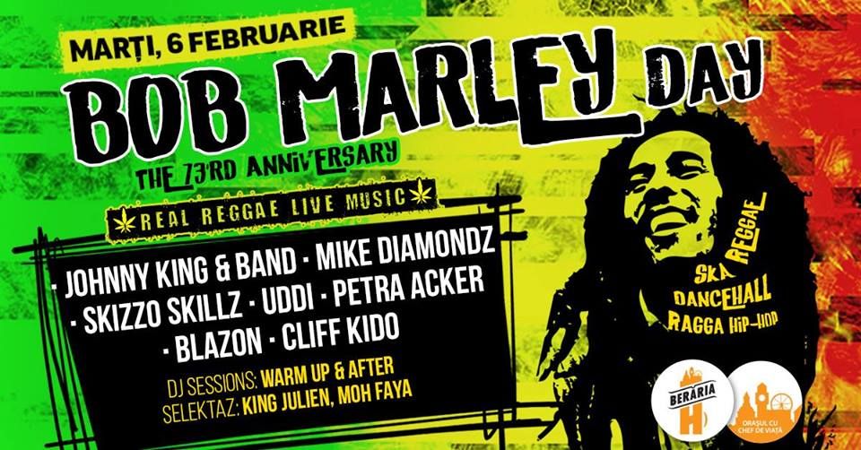 MarÈ›i, 6 Februarie, celebrăm aniversarea cu numărul 73 a legendarului Bob Marley alături de Johnny King & Band, Mike Diamondz, Skizzo Skillz, UDDI, Petra Acker, Blazon, Cliff Kido, etc. Vino să ne bucurăm împreună de cea mai bună muzică Reggae, Ska, Dancehall, Ragga, Hip-Hop È™i DJ Sessions cu băieÈ›ii de la Selektaz (King Julien, Moh Faya).