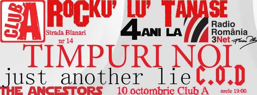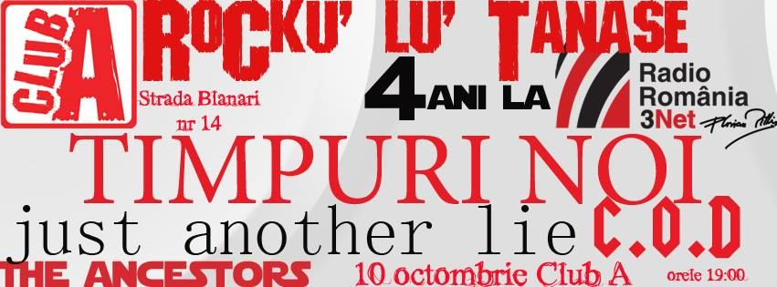 S-au implinit 4 ani de cand am inceput aceasta frumoasa emisiune de rock romanesc, gazduita atat de bine si de potrivit de Radio3Net "Florian Pittis" Rocku lu Tanase intra deja in sezonul 5. Anul trecut am sarbatorit in CLUB A, anul acesta suntem din nou oaspeti in aceasta oaza a culturii bucurestene. 4 trupe mai mari sau mai mici ne vor canta pe zece octombrie, pentru rockul romanesc, pentru rocku lu Tanase: Timpuri Noi, care nu mai are nevoie de nicio prezentare, Just Another Lie, o trupa care mie imi place foarte mult si va va placea si voua, un altfel de punk. C.o.d, hard rock si alternative in aceeasi reteta, iar copiii de la The Ancestors vor incepe seara.