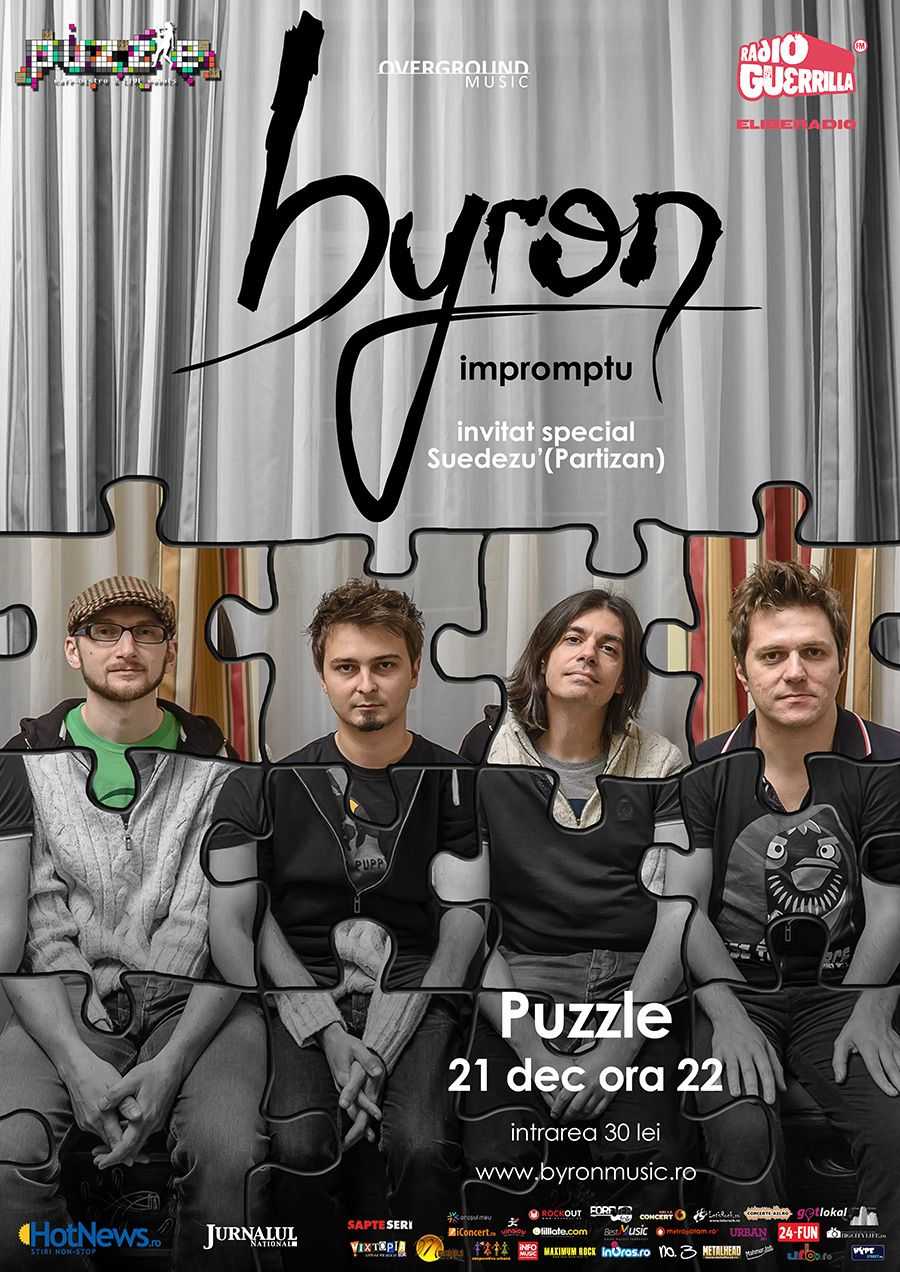 Daca va era dor de o seara de improvizatie muzicala marca byron, avem vesti bune: baietii reincep seria de experimente, giumbuslucuri si nebunii live Impromptu! Sambata, pe 21 decembrie 2013, de la ora 22:00, byron vor urca pe scena clubului Puzzle din Bucuresti (Piata Victoriei) fara nimic pregatit in prealabil, gata de a-i surprinde pe cei din public si lasandu-se ei insisi surprinsi de ce o sa iasa!
