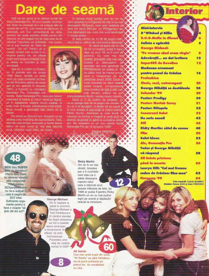 George Michael, All Saints, Ricky Martin nu au salvat postul Adelinei Ionescu, ÅŸef redactorul revistei SALUT. Îmi aduc aminte de scandalul Premiilor Ballantines, organizat de Media Pro în noiembrie 1998, unde doar vedetele din familia MediaPro au fost premiate … Toată presa a remarcat manevra. Ballantines s-a retras din proiectul care se dorea să fie o Gală de premii anuale organizate de Media Pro. Zece ani mai târziu, grupul deÅ£ine MTV. Deci, pe termen lung, ÅŸi-au menÅ£inut linia.