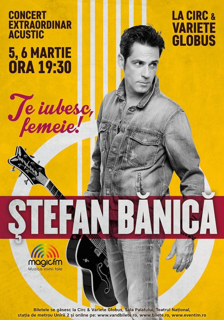 Stefan Banica sustine in luna martie, pentru al cincilea an consecutiv, doua concerte acustice de exceptie, dedicate Zilei Femeii. Spectacolele vor avea loc pe 5 si 6 martie, orele 19:30, la Circ & Variete Globus, sub titulatura “Te iubesc, femeie!". Cu acest prilej, Stefan Banica aduce in dar doamnelor si domnisoarelor un buchet cu cele mai frumoase cantece de dragoste, hituri binecunoscute si asteptate de public de fiecare data, dar si cantece noi sau piese care i-au marcat cariera impresionanta de peste 25 de ani.
